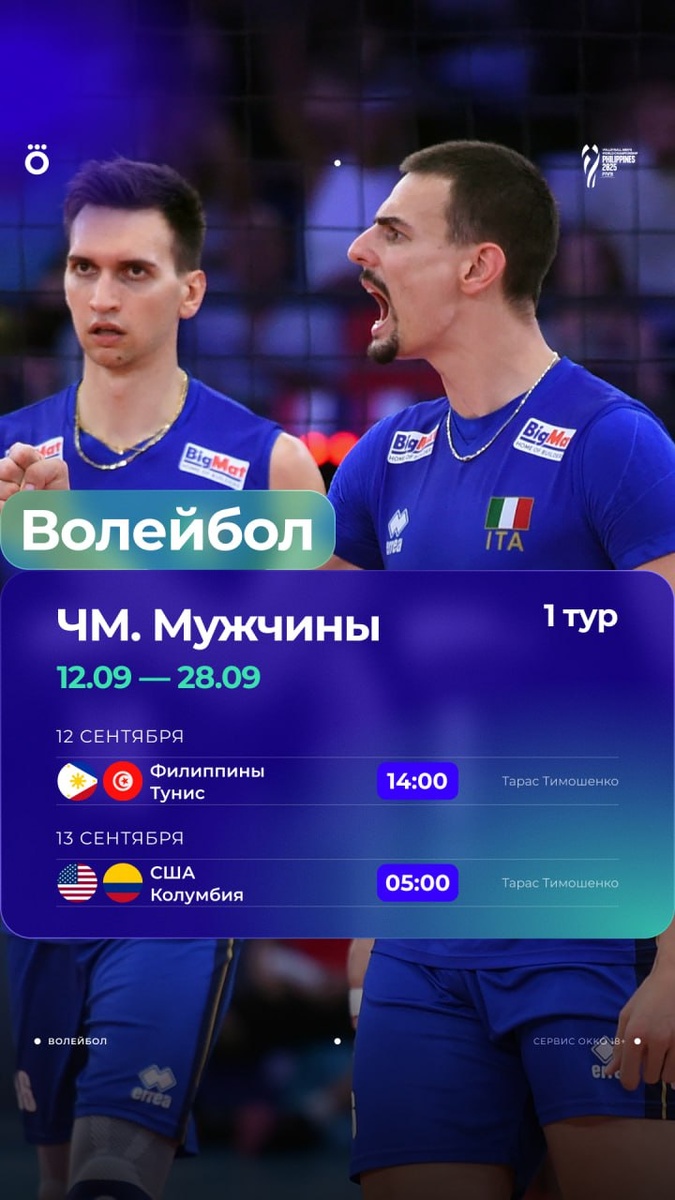 🏐 Завтра стартует мужской ЧМ по волейболу. Огонь. Турнир пройдет на Филиппинах с 12 по 28 сентября. Изучай расписание первого тура и смотри в Okko: okko.tv/s/ths