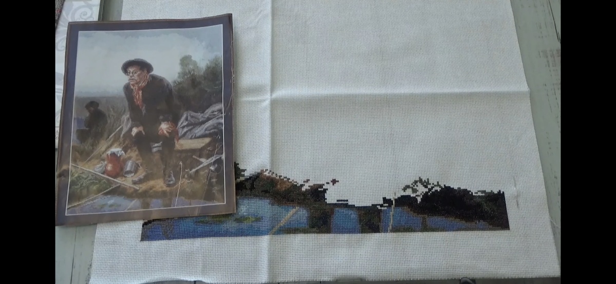 Добрый вечер, дорогие друзья! Летом вышивать удавалось немного и в сентябре такая же история. Огородные хлопоты, консервирование, работа по своей должности и за воспитателей. Но зато, как доберусь до вышивки- с таким упоением и удовольствием все вышивается! Так приятно держать иголку в руках! И так она пляшет и рисует крестики на канве- просто песня и поэзия. Достала я своего любимого, но врукинедоходившего рыбака. Скажет:- " Ну наконец- то она вспомнила и поимела совесть меня повышивать!" Да, наконец дошли руки и до него и я с огромным удовольствием посвятила ему приличное количество времени. Даже его самого вышивать начала. Видите носок сапога? Кстати, теперь не хочу эту работу откладывать и запланировала ее на осень. На очереди была прелестная девушка от Риолис, "Книжный клуб". Этой работе времени досталось не много, но вполне достаточно, чтоб продвижения были хорошо ощутимы. Осталось довышивать в правой стороне розочки, а это два, три вечера и вышить весь бэк. Чем я и займусь в с