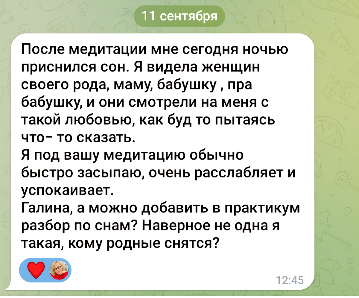 Сегодня получила ещё один отзыв от участницы практикума. Да! Разбор снов обязательно будет! Это очень важная часть соединения с предками. Работа с Родом восстанавливает здоровье и даёт сил. А волшебная медитация успокаивает и избавляет от бессонницы. Присоединяйтесь и прочувствуйте сами Информация по доступу к практикуму https://t.me/galaktika_womans/3522