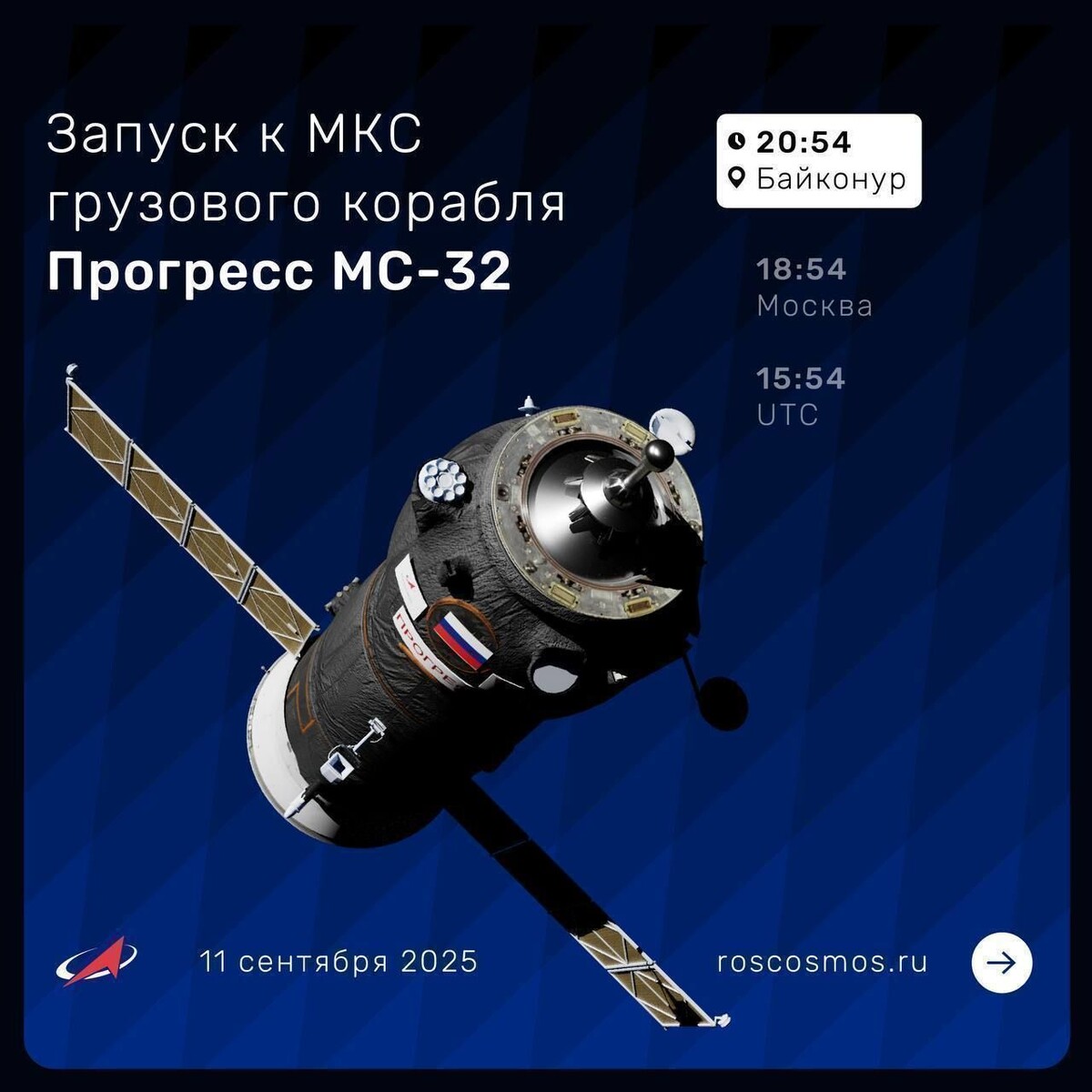 Ракета-носитель «Союз-2.1а» успешно стартовала с космодрома Байконур, доставив на орбиту грузовой корабль «Прогресс МС-32». Пуск состоялся 11 сентября в 18:54 московского с 31-й площадки, трансляцию вел «Роскосмос». После отделения от третьей ступени ракеты «Прогресс» вышел на орбиту и взял курс на Международную космическую станцию. Полет пройдет по двухсуточной схеме: корабль совершит 34 витка вокруг Земли, а стыковка с модулем «Звезда» российского сегмента МКС запланирована на 13 сентября в 20:27 по Москве. На борт станции «Прогресс МС-32» доставит более 2,5 тонны грузов – свыше 1,1 тонны сухих грузов для экипажа и систем станции; 870 кг топлива для дозаправки; 420 кг питьевой воды; 50 кг воздуха для поддержания атмосферы. Также на МКС прибудет новый скафандр «Орлан-МКС» № 7, необходимый для выхода в открытый космос. Сейчас на станции работают семь человек: российские космонавты Сергей Рыжиков, Алексей Зубрицкий и Олег Платонов, астронавты NASA Зена Кардман, Джонатан Ким и Майкл Финк