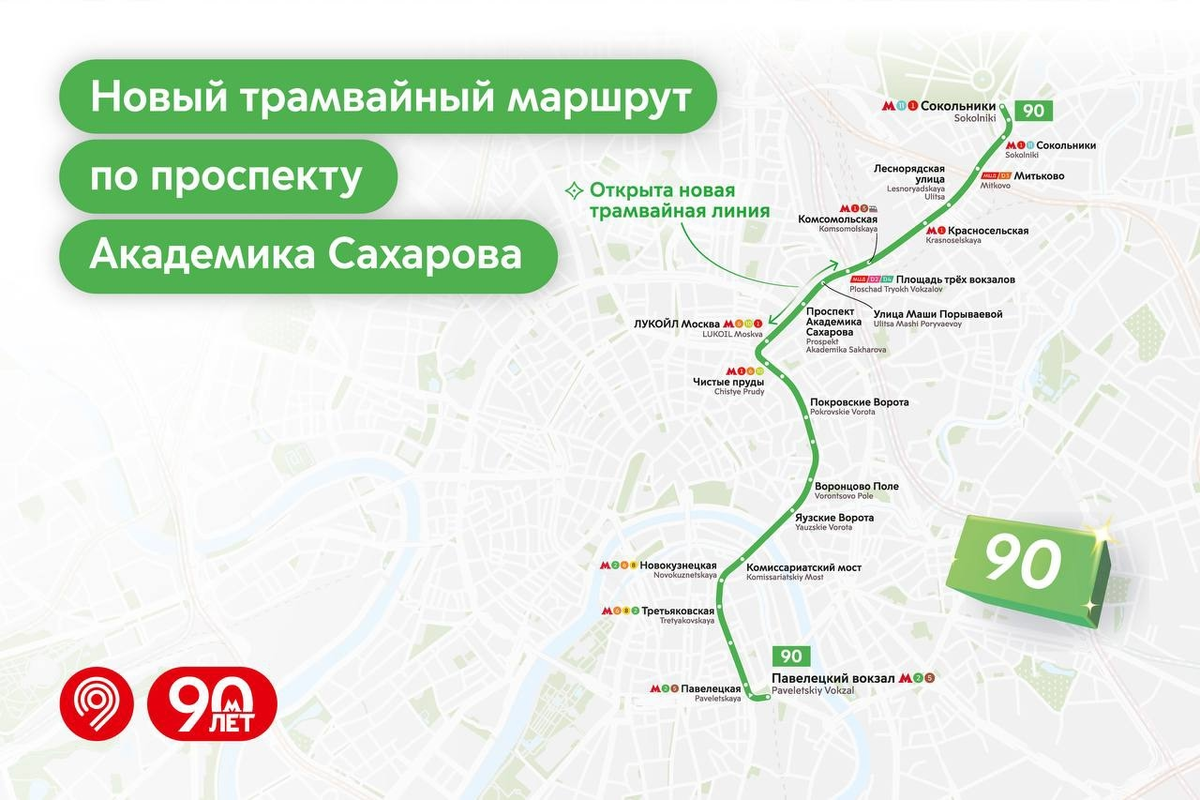 10 сентября 2025 года в Москве было открыто движение нового трамвайного маршрута по новой линии. До сентября 2025 года проспект Академика Сахарова и улица Маши Порываевой были одними из немногих магистральных улиц Москвы, на которых отсутствовало движение общественного транспорта. Чтобы добраться до нужного места, горожанам приходилось идти 10–12 минут пешком от станций метро или Московских центральных диаметров либо пользоваться такси и личным автотранспортом. Теперь же жители данных улиц могут пользоваться трамваем, включающем в себя и вновь построенный участок протяженностью 2,1 км от Чистых прудов до Площади трех вокзалов. На новой линии начал курсировать новый маршрут с самым большим для столицы номером 90 (судя по всему такой номер присвоен в честь 90-летия московского метрополитена). Новый маршрут связал между собой Сокольники и Павелецкий вокзал. Особенностью линии является отсутствие контактной сети на всем вновь построенном участке. Трамваи данный участок проходят на автоном
