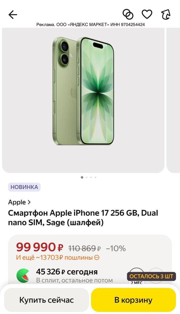 iPhone Air стал ПЛАСТИНКОЙ: недавно Apple показала самый тонкий айфон в истории. Внутри самая лучшая начинка: 🟢 Топовое изображение — 120 Гц OLED. 🟢 Повышенная прочность —Ceramic Shield 2. 🟢 Мощность — чип A19 Pro и 12 Гб ОЗУ. 🟢 Прайс — Air от 135 тысяч рублей, Pro от 143 тысяч, Max от 152 тысяч. Заказать можно на Яндекс Маркете - https://market.yandex.ru/cc/7a4qg8