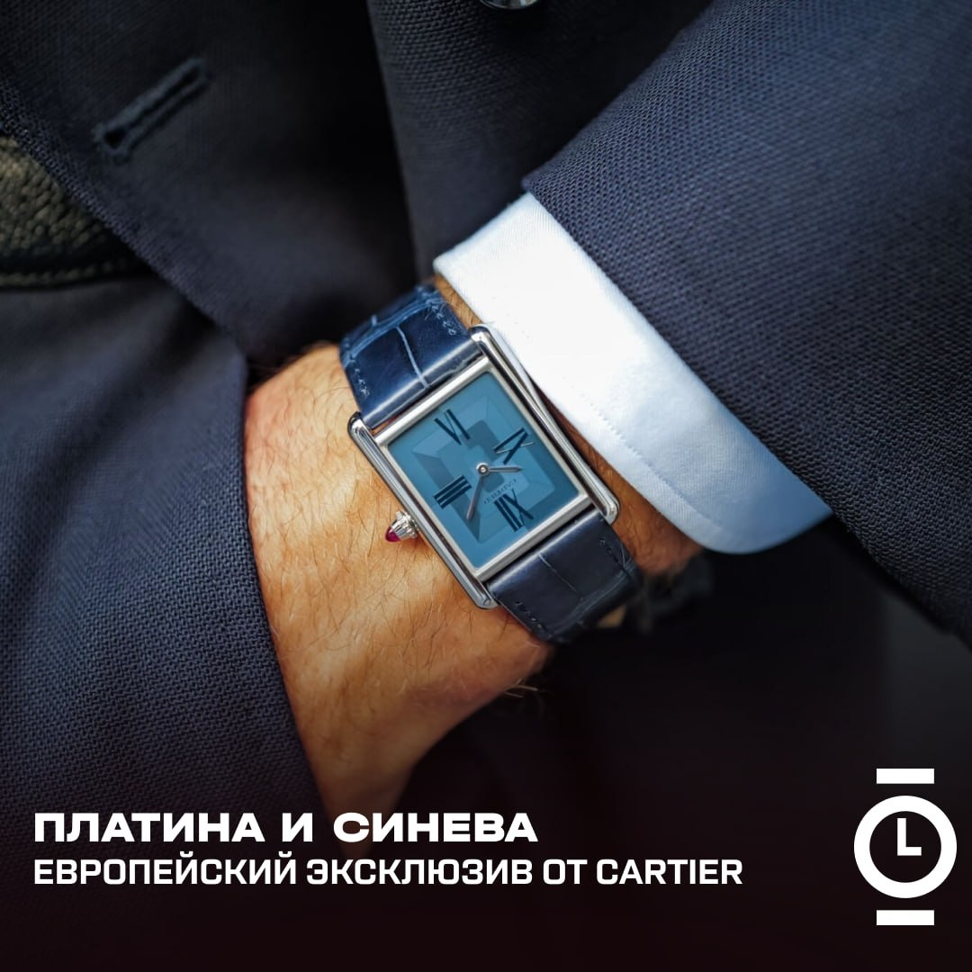 ПЛАТИНА И СИНЕВА: ЕВРОПЕЙСКИЙ ЭКСКЛЮЗИВ ОТ CARTIER #обзор_WD Когда речь заходит о часах Cartier, первыми на ум приходят Santos. Но сегодня стоит вспомнить другую легенду — первые наручные часы бренда. Cartier начал создавать часы ещё в 1853 году, всего через шесть лет после основания ателье Луи-Франсуа Картье. В честь 170-летия часового дела представлена лимитированная европейская серия Tank Louis Cartier LM в платиновом корпусе с синим циферблатом в стиле ар-деко. Несмотря на название LM («Large Model»), размеры здесь очень скромные: корпус длиной менее 34 мм и шириной 25,5 мм при толщине 6,6 мм. Пропорции отсылают к винтажным традициям и придают модели элегантность. Корпус выполнен из платины 950-й пробы, боковые поверхности отполированы, а части корпуса между ушками сатинированы. Задняя крышка тоже платиновая, с гравировкой лимитированной серии и местом для персональной надписи. Коронка украшена кабошоном из рубина. Циферблат выделяется глубоким синим оттенком, полученным методо