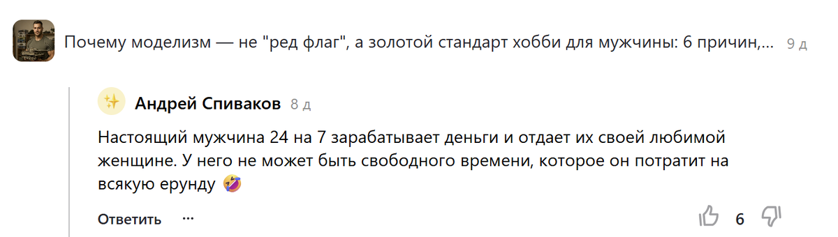Тот самый комментарий утверждает: «Мужчина должен только зарабатывать и отдавать». Но парадокс в том, что хобби, особенно моделизм, нередко становится дополнительным источником дохода.