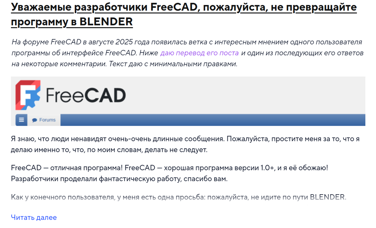 На форуме FreeCAD в августе 2025 года появилась ветка с интересным мнением одного пользователя программы об интерфейсе FreeCAD Фрагмент статьи. . . . Мы начали создавать быстрые прототипы и анимационные ролики, чтобы показать их потенциальным клиентам, благодаря быстрому движку рендеринга. Мы даже сделали пару простых 3D-анимаций текста для одного производственного видео в Blender. Но потом мы столкнулись с обратной стороной Blender: изменения вносились в программу так быстро, что, если мы откладывали работу на три месяца, оказывалось, что всё в программе изменилось. Прошлым летом мы установили несколько новых систем и загрузили последнюю версию Blender, потому что нам нужна была простая 300-кадровая анимация. Но, потом интерфейс изменился, изменился способ отображения некоторых элементов, что потребовало от нас дополнительных изменений в наш продукт, и в результате Blender был удалён со всех чёртовых компьютеров в компании . . . Все мои статьи теперь выходят только на Орбите. https://