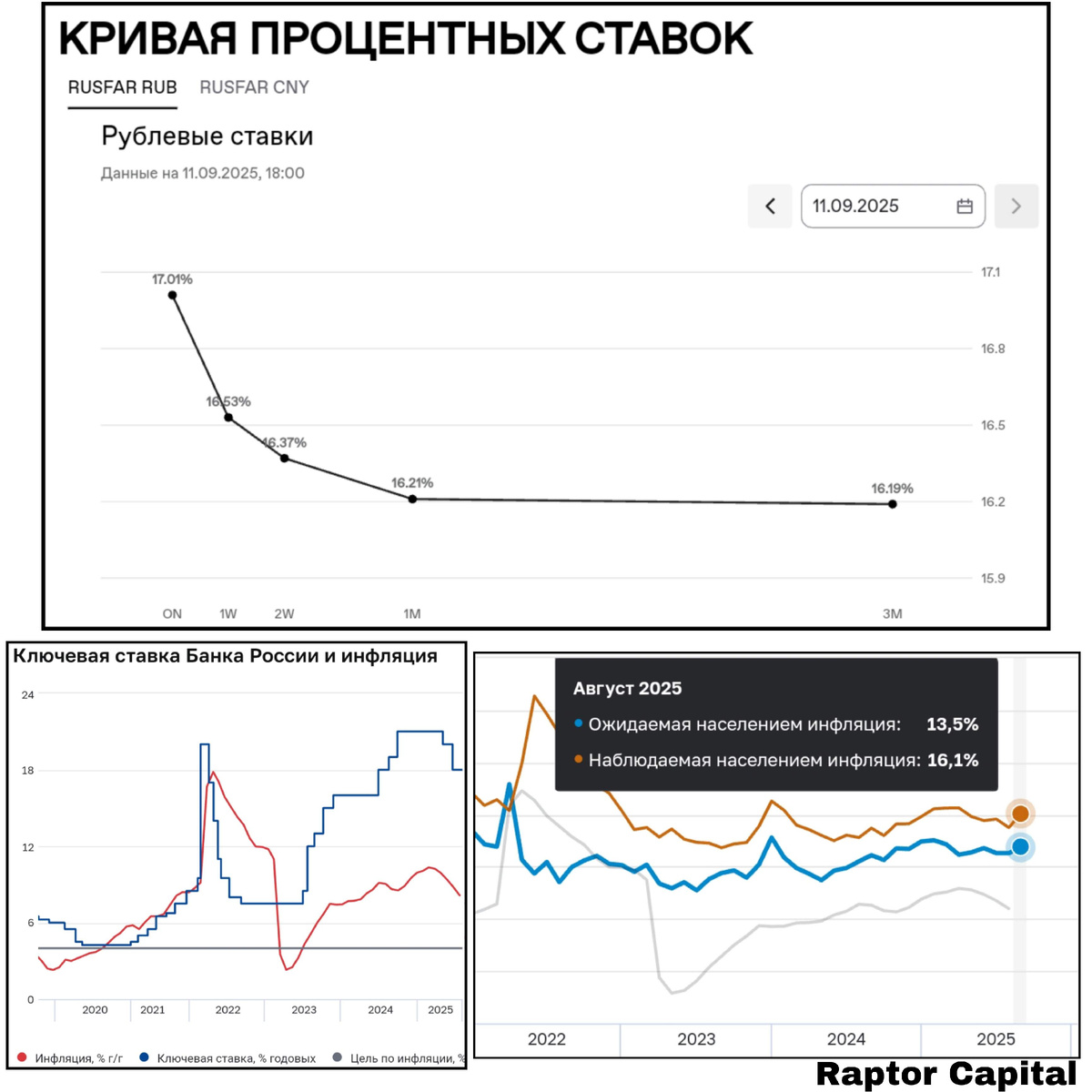• Ставка RUSFAR (показывает стоимость обеспеченных денег) сейчас на один день – 17,01%, на 3 месяца – 16,19% (верхний график). Это означает, что банки ждут завтра снижение ключевой ставки до 17%, и ставку 16% к концу года. Перед заседанием ЦБ в июле банки ждали снижение ставки до 19%, но ошиблись – ставку снизили до 18%.