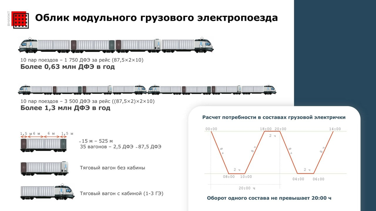 Научно-исследовательский институт железнодорожного транспорта (ВНИИЖТ) разработал концепцию грузовых электропоездов. В основе решения лежит подобие электропоезда. Это будут модульные составы постоянного формирования с кабинами управления по концам поезда. Вместо пассажирских вагонов в составе будут платформы со съемными контейнерами разного формата и размера. При разгрузке поезд не расцепляется, снимаются или загружаются лишь контейнеры. Такой поезд может ходить по расписанию по аналогии с пассажирским поездом. Внедрение данных составов, по мнению разработчика, позволит железным дорогам конкурировать c автотранспортом и привлечь дополнительных грузоотправителей, при условии перетока грузов с автотранспорта на модульные грузовые электропоезда в объеме 13 млн. тонн дополнительная выручка для ОАО "РЖД" может составить 45,9 млрд. рублей. Скорость данных поездов может составлять порядка 140 км/ч, они могут быть использованы на участке Петербург - Москва после запуска в эксплуатацию отдельно