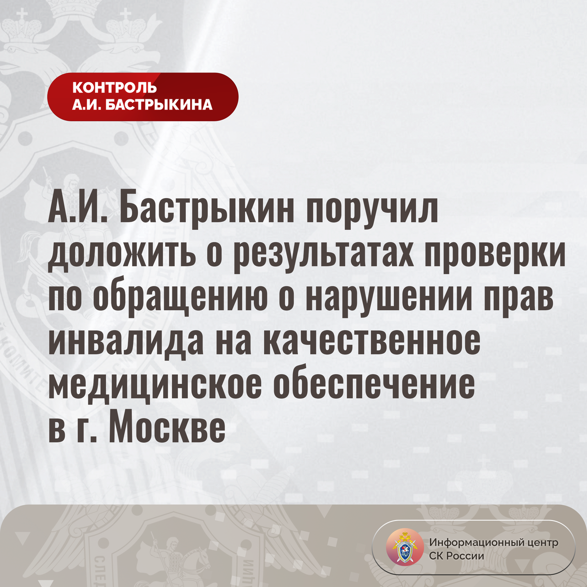 А.И. Бастрыкин поручил доложить о результатах проверки по обращению о нарушении прав инвалида на качественное медицинское обеспечение в г. Москве В комментариях в аккаунте Информационного центра СК России «ВКонтакте» обратилась инвалид 1 группы из города Москвы по вопросу нарушения ее прав на качественное медицинское обеспечение. На протяжении текущего года женщине, страдающей сахарным диабетом и сопутствующими заболеваниями, не предоставляются датчики к системе непрерывного мониторинга. Кроме того, в медицинском учреждении игнорируются жалобы заявительницы на ухудшение состояния здоровья, отказывается в проведении врачебной комиссии. Многочисленные обращения в различные инстанции результатов не принесли. В ГСУ СК России по городу Москве организована процессуальная проверка. Председатель Следственного комитета Российской Федерации Александр Иванович Бастрыкин поручил руководителю ГСУ СК России по городу Москве Дмитрию Владимировичу Беляеву доложить о предварительных и окончательных рез