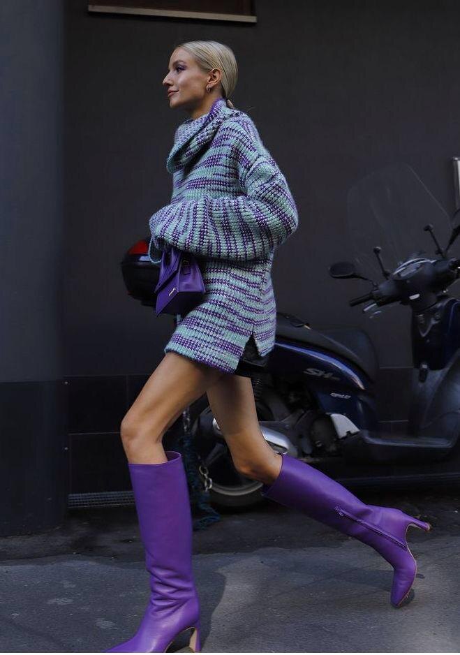 Королевский фиолетовый + сапоги-чулки Фиолетовые сапоги-чулки станут ярким акцентом в монохромном образе. Сочетайте их с черным платьем-миди или серым костюмом. Для смелых экспериментов добавьте аксессуары в тон или сыграйте на контрасте с охрой или лаймовым.