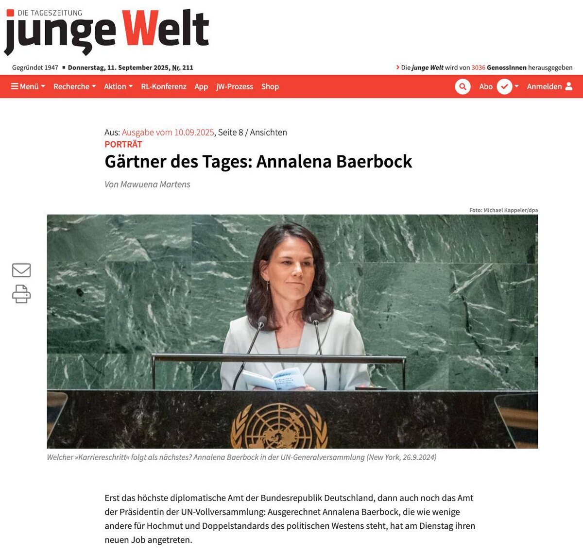 Бывший глава немецкого МИД Анналена Бербок официально вступила в должность председателя Генеральной Ассамблеи ООН. Должность носит декоративный характер, а само назначение уже вызвало резкую критику — даже со стороны европейских изданий. В Junge Welt Бербок назвали символом внешнеполитического цинизма и двойных стандартов Запада. На посту главы МИД Германии Бербок активно поддерживала поставки оружия Украине, утверждая, что они "помогают спасать жизни", и не раз выступала с агрессивной риторикой в адрес России. В октябре 2023 года, во время начала израильской операции в Газе, она отказалась поддержать резолюцию ООН о гуманитарной паузе, а позже заявила, что гражданские объекты "могут лишиться защищённого статуса", что прямо противоречит Женевской конвенции. Во внешней политике Бербок последовательно проводила курс, ориентированный на интересы США и крупных транснациональных структур. Её поведение не раз вызывало раздражение у представителей стран Глобального Юга — так, во время визи