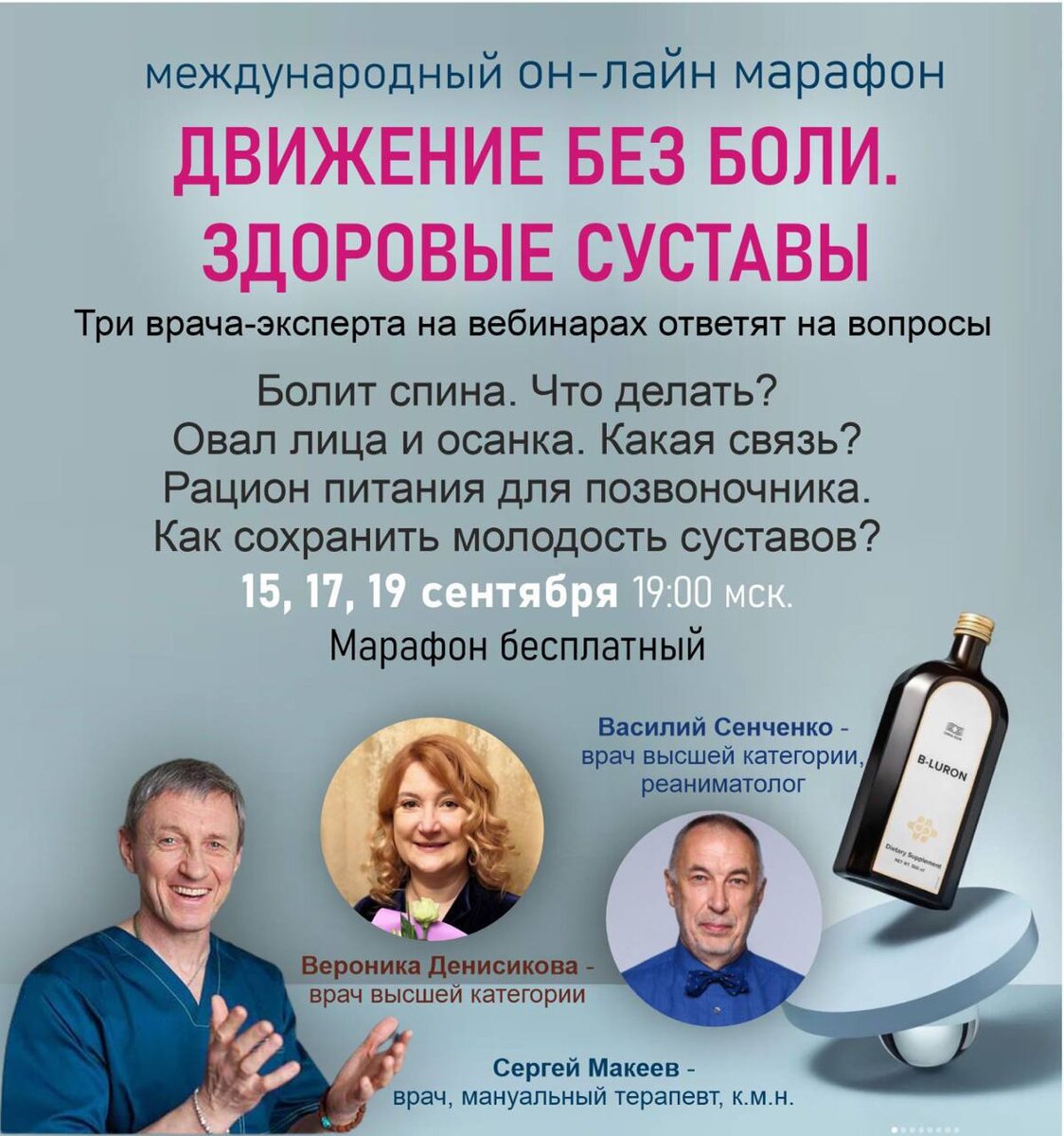 Бесплатный марафон по восстановлению суставов: без боли, без операции Хочешь начать двигаться к своей цели, но не знаешь с чего начать? Приглашаем на бесплатный марафон из трёх вечерних эфиров: 15, 17 и 19 сентября перевернут твой взгляд на восстановление суставов без операций, боли и протезов После трёх вечеров предлагаем продолжить в нашей программе — там будет персональные программы, консультации, наблюдение нутрициолога и возможность получить реальные результаты. Когда и как: • Встречи проходят онлайн вечером: удобное время, чтобы посмотреть после работы. • Участие бесплатное. Регистрация обязательна — места ограничены. Дополнительно: • Формат подходит для людей с коксартрозом, артрозом, болями в колене/локте/пояснице, подагрой, и другими проблемами суставов. • В конце марафона — предложение перейти в программу с персональным планом восстановления. Как попасть на марафон перейди по ссылке https://chat.whatsapp.com/LnNuW2uoQpA6fhCPdF575a?mode=ems_copy_h_t