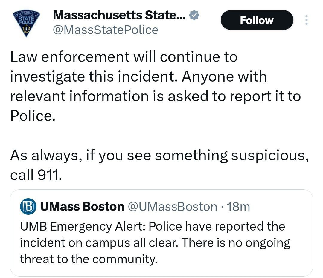 В ответ на пост ALL CLEAR confirmed at UMass Boston NO threats found — investigation ongoing
