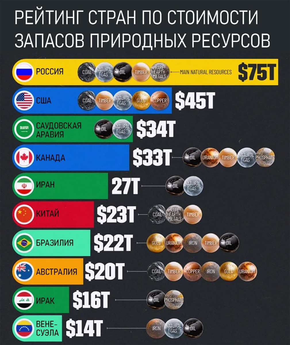 Россия — №1 по стоимости природных ресурсов в мире Богатая ресурсная база делает Россию лакомым кусочком привлекательным партнёром для международного сотрудничества в сфере добычи полезных ископаемых. По словам главы РФПИ Кирилла Дмитриева, именно из-за лидирующей позиции Россия сталкивается с давлением со стороны глобалистов и "глубинного государства". Задача западных "партнёров" — постоянно кусать Россию и не оставлять её в покое, в развитии. Иначе она разовьётся. Итак, топ-5 стран: 1️⃣ Россия №1 по запасам природных ресурсов, общая стоимость которых оценивается в $75 трлн, включая уголь, газ, нефть, золото, древесину и редкоземельные металлы. 2️⃣ США — $45 трлн за счёт угля, древесины, газа, золота и меди. 3️⃣ Саудовская Аравия — $34 трлн благодаря значительным запасам нефти и древесины. 4️⃣ Канада — $33 трлн за счёт нефти, урана, древесины, газа и фосфатов. 5️⃣ Иран замыкает топ-5 — $27 трлн благодаря запасам нефти и газа. Граждане уже, наверное, прикинули, сколько бы каж