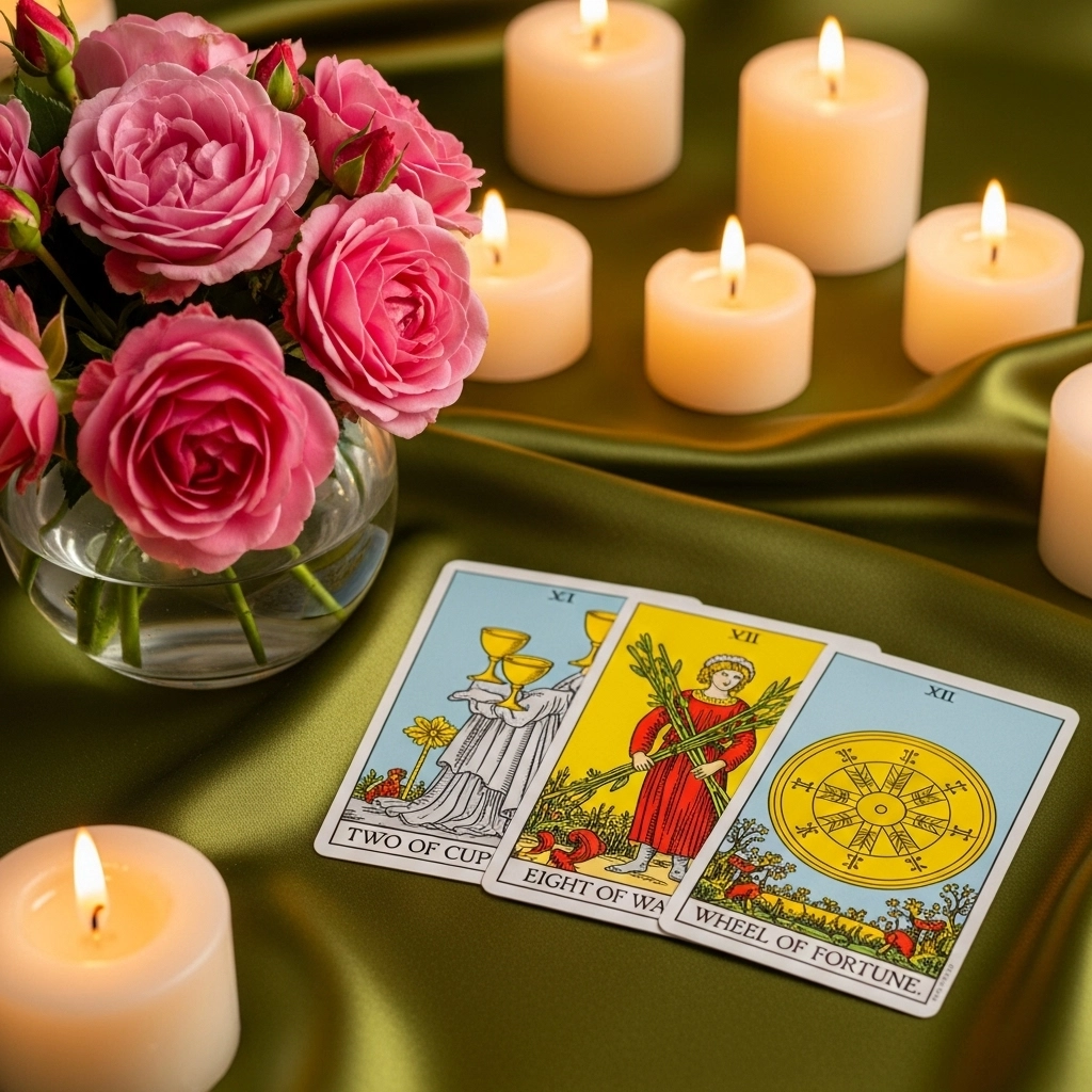 Глубокий анализ: На более глубоком уровне Колесо Фортуны говорит о том, что Вселенная готовит для Вас дверь к судьбоносным событиям, которые могут изменить ход Вашей жизни. Это может быть удача, неожиданный шанс или поворот, который приведёт Вас к новому этапу. Эта карта подчёркивает, что сейчас Вы находитесь в точке, где циклы меняются, и Вселенная направляет Вас к чему-то большему, даже если Вы пока не видите полной картины. В сочетании с Двойкой Кубков это может указывать на судьбоносную встречу или поворот в отношениях, а с Восьмёркой Жезлов — на то, что эти перемены произойдут быстро и неожиданно. Вселенная говорит: "Доверься судьбе, колесо крутится в твою пользу!"