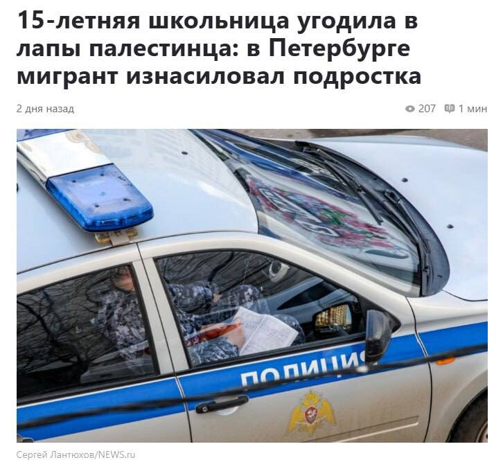 В Питере палестинец впервые изнасиловал ребёнка. 28-летний палестинец Мухаммад Салех родом из Газы, приехал в Россию как гуманитарный беженец. Ему выделили жильё, еду, мед помощь и даже сделали какие-то документы. 5 сентября палестинцу нашли работу, устроили резчиком мяса на мясокомбинат. 8 сентября палестинец пришёл с работы злой и возбуждённый, поэтому он вышел на улицу, похитил восьмиклассницу и изнасиловал у себя в квартире. На допросе он заявил, что впервые видит на улицах "неверных" женщин без хиджаба. Себя он виноватым не считает, так как "действовал по корану". 👉🏻Новости №1 в Ростове 💌Прислать новость/фото