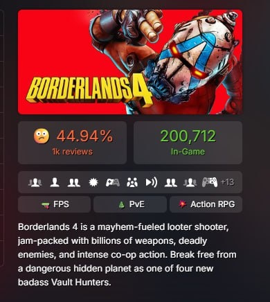 Borderlands 4 пробила онлайн в 200 тысяч игроков в Steam.