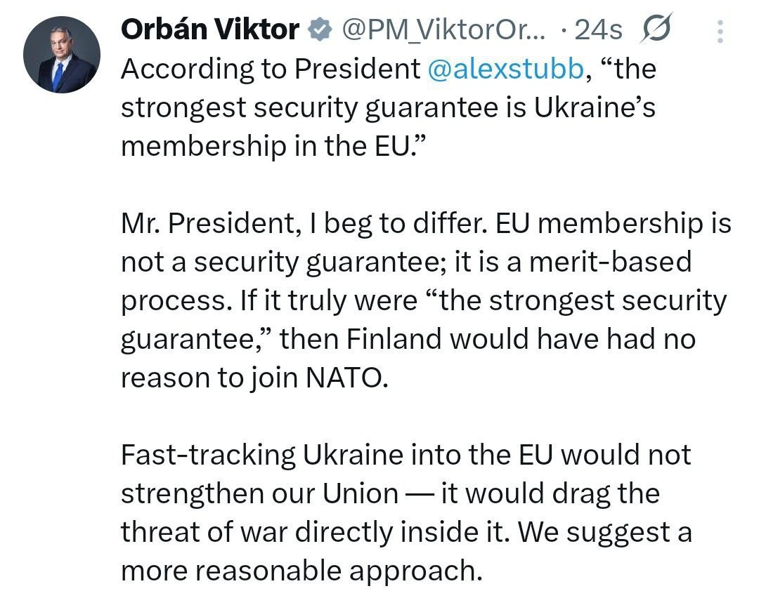 Finland’s Stubb with Zelensky: 'strongest security guarantee will be Ukraine’s EU membership' Hungary’s Orban responds: I beg to DIFFER Says fast-tracking Ukraine into EU would 'DRAG threat of war directly inside it'