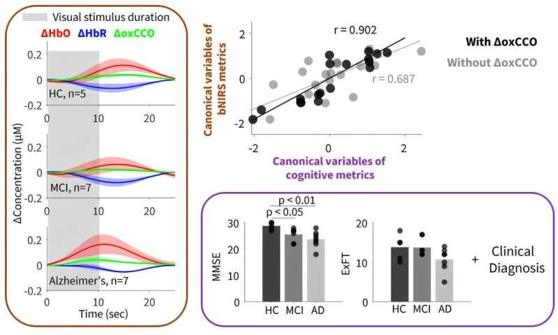 Диагноз «деменция» часто ставят слишком поздно. Современные методы — МРТ или ПЭТ — дают подробные данные о структуре и работе мозга, но стоят дорого и мало подходят для регулярного скрининга. Учёные из Великобритании предложили альтернативу: компактный прибор на основе широкополосной ближней инфракрасной спектроскопии (bNIRS). Он способен фиксировать изменения в мозге, связанные с болезнью Альцгеймера, ещё на ранних стадиях. Результаты пилотного исследования опубликованы в журнале «Journal of Biomedical Optics». В отличие от стандартной ближней ИК-спектроскопии, которая отслеживает только насыщение крови кислородом, bNIRS дополнительно фиксирует активность фермента цитохром c-оксидазы (oxCCO). Этот митохондриальный фермент играет ключевую роль в выработке энергии, а его активность заметно снижается при болезни Альцгеймера. Учёные проверили метод на трёх группах добровольцев: Испытуемым показывали простой шахматный визуальный стимул и одновременно фиксировали уровень кислорода в крови и