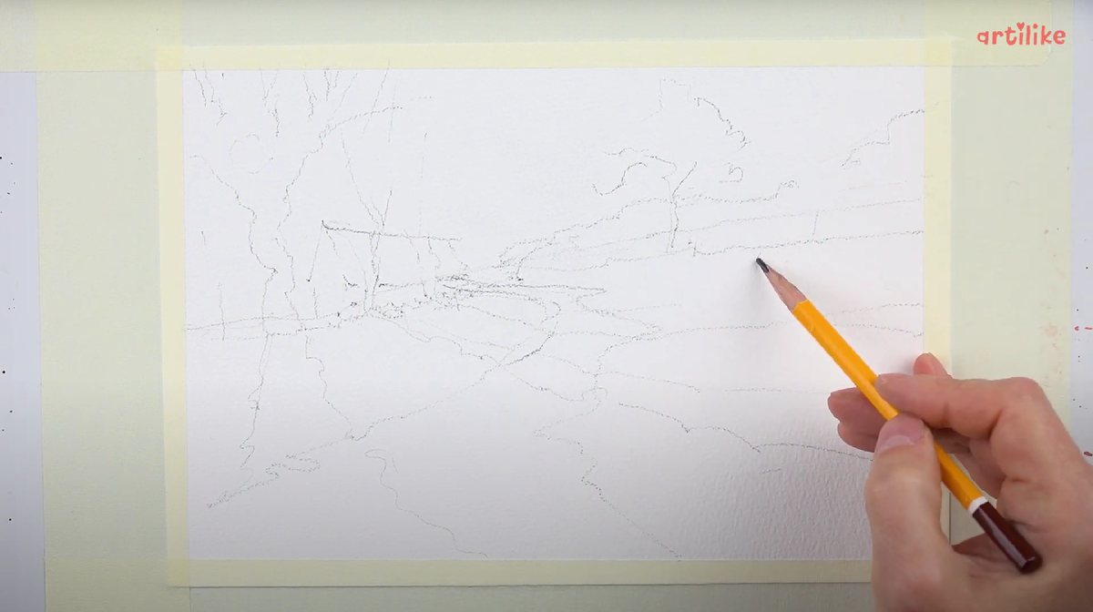 Этот урок поможет вам создать лёгкий, воздушный пейзаж с красивыми переходами цвета и света ✨. Шаг 1: Карандашный рисунок 1. Карандашом наметьте основные элементы: линию горизонта, дорогу, силуэты деревьев и домик. 2. Аккуратно прикрепите лист к планшету малярным скотчем. Это создаст аккуратную белую рамку в конце 🖼️. 3. Смачивайте только лицевую сторону бумаги. Шаг 2: Пишем небо и землю. Это самый важный этап, где закладывается настроение картины! 1. Хорошо смочите чистой водой участок с небом и передний план. 2. Пока бумага мокрая, начинайте писать небо. Слева (со света) введите разбавленную охру. Справа — светлый ультрамарин 🌤️. 3. Сразу же пишите траву и дорогу смесью сиены и умбры. Закрашивайте всю область — светлые участки дороги выделим позже. Шаг 3: Дальний план и первые тени 1. Пока низ ещё влажный, напишите деревья на дальнем плане справа. Используйте красно-фиолетовую гамму 🎨. 2. По мокрому добавьте падающие тени от деревьев на траву. Это свяжет элементы картины. 3. Д