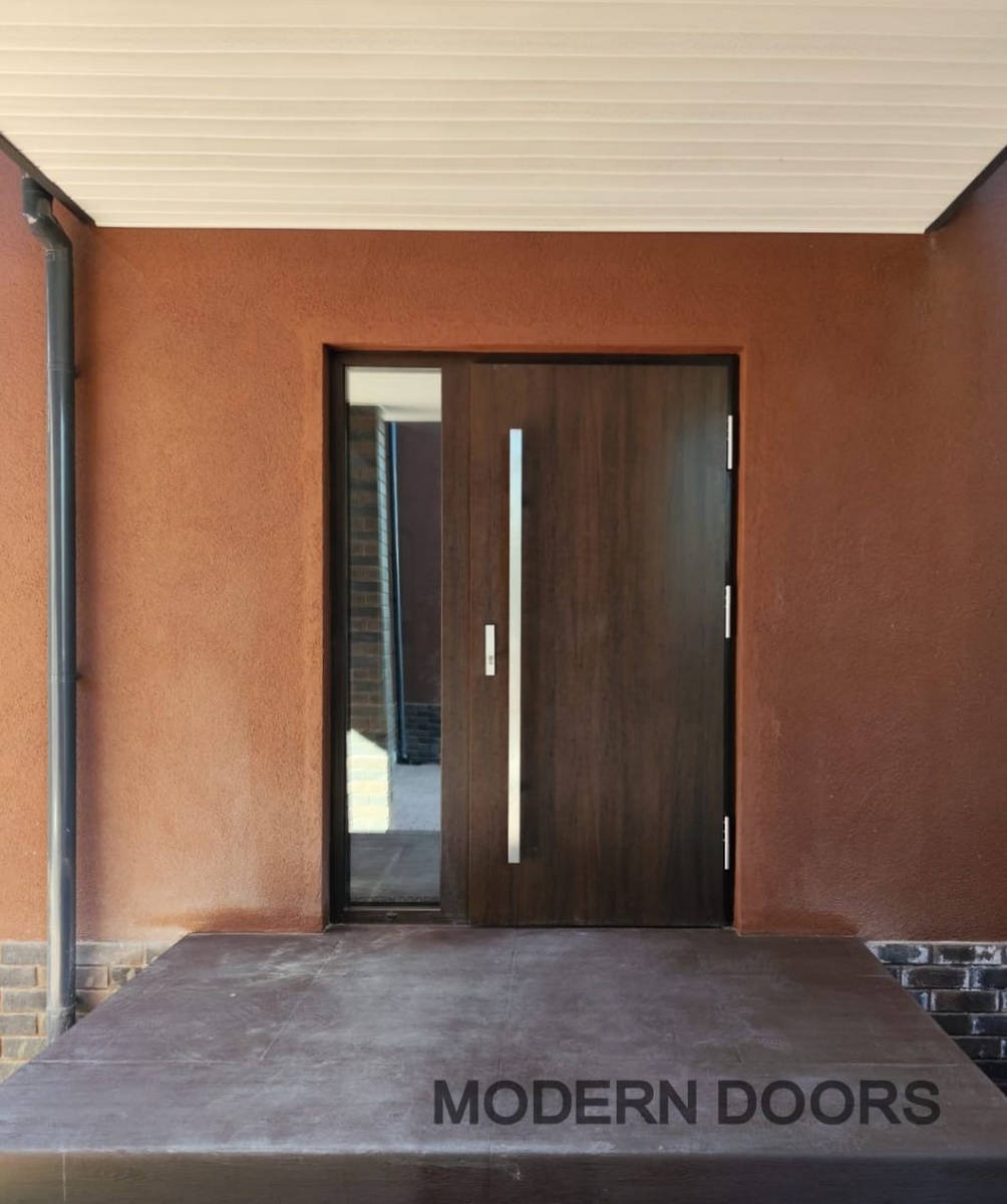 Очередная прекрасная реализация из Московского региона от MODERN DOORS. Стильная входная группа на теплом алюминии в ламинации "темный дуб".