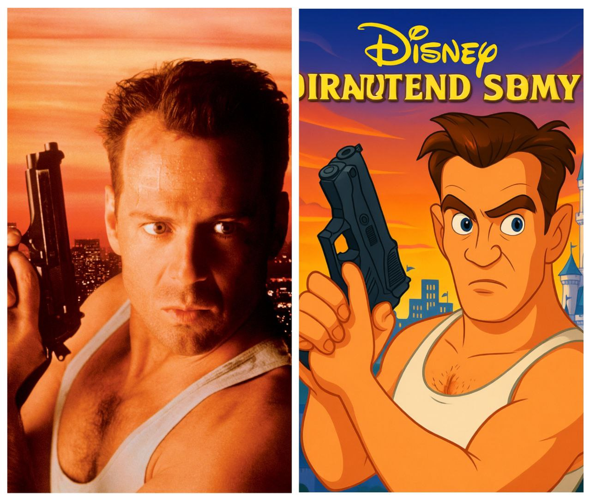 Здравствуйте, коллеги-киноманы. На героев боевиков в игре GTA мы с вами посмотрели, по Музею мраморных боевиков тоже уже прогулялись. Теперь перенесёмся в альтернативную реальность — туда, где студия Disney решила выпускать анимационные ремейки известных боевиков. Представим, как в таком случае будут выглядеть постеры. Также по теме: Волос больше, а здания современного мегаполиса удачно соседствуют с диснеевским замком. А вот зверёк, который в левой части диснеевского постера — это хищник и есть? Никаких кораблей и поездов — только волшебный туман, только хардкор! Интересно, как он будет стрелять с таким косоглазием? Смотрю на них и сразу понимаю — где Лундгрен, где Ван Дамм. Нечто, похожее на её руку, пробило ему туловище. На Солнце явно какая-то вспышка. Но герой привычно улыбается. Чёрный стал белым. Очень неожиданный ход для Disney. Азиат переметнулся к европеоидной расе. Тоже неожиданно. Зато тут мужчина стал женщиной. Всё в духе кинокомпании. Пёсель так и ждёт косточку. Не "Пятый