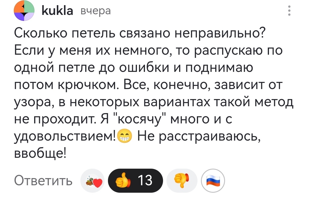 Вчера получила комментарий, который перевернул мое представление об ошибках в вязании! Да и не только в вязании. Это реально крутая мысль о жизни в целом! Точнее, к отношению к своим промахам и ошибкам.