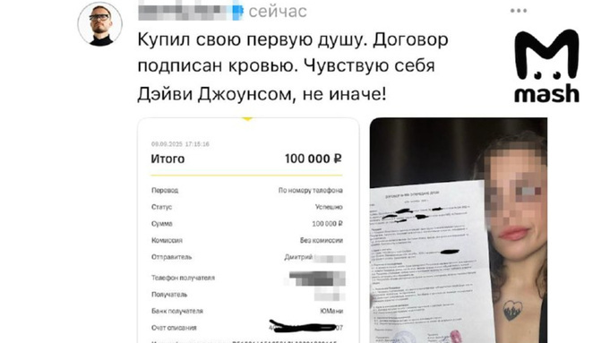 Девушка, получив деньги, потратила их на коллекционную игрушку лабубу и билет на концерт певицы 26-летняя жительница Москвы Карина стала участницей необычной сделки, согласившись продать свою душу за 100 тысяч рублей, пишет Telegram-канал Mash. Предложение поступило от маркетолога Дмитрия, разместившего на одном из российских сайтов провокационное объявление о покупке душ с официальным оформлением договора и подписью кровью. Как позже признался мужчина, это был пиар-ход для привлечения внимания, и он не ожидал, что найдется реальный желающий. «Девушка, получив деньги, потратила их на коллекционную игрушку лабубу и билет на концерт Надежды Кадышевой. История вызвала резкую реакцию Русской православной церкви: представители РПЦ назвали Карину грешницей, а Дмитрия – Сатаной*, призвав обе стороны раскаяться и посетить храм», – пишет Telegram-канал. Общество разделилось в оценках: одни считают историю абсурдным пиаром, другие усматривают в ней признаки духовного кризиса. Дмитрий и Карина не