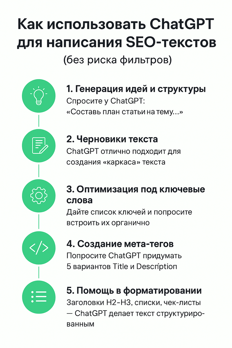 Используйте его для идей, черновиков и оптимизации, а уникальность и экспертность всегда добавляйте вручную. 👉 Подписывайтесь на канал, скоро покажу готовый чек-лист промтов для ChatGPT, чтобы писать SEO-статьи в 2 раза быстрее.