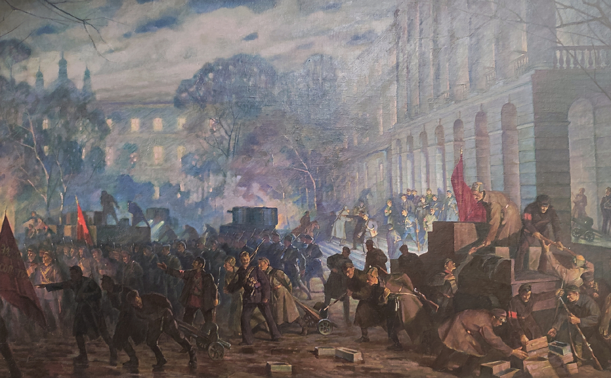 В.И. Ленин приходит в Смольный вечером 24 октября 1917 г. К этому времени Смольный являлся символом революционных событий - здесь работал Петроградский Совет рабочих и солдатских депутатов и находился штаб Революции – Военно-революционный комитет. Многофигурная композиция изображена на фоне холодного ветреного октября 1917 года. На крыльце стоят руководители революции: Ленин, Сталин, Свердлов и другие, горят костры, отряды красногвардейцев уходят в ночь штурмовать Зимний. Автор работал над картиной много лет и закончил ее к 1936 году. Полотно было отправлено на Всемирную Выставку в Париже 1937 г., где завоевало Большую золотую медаль.