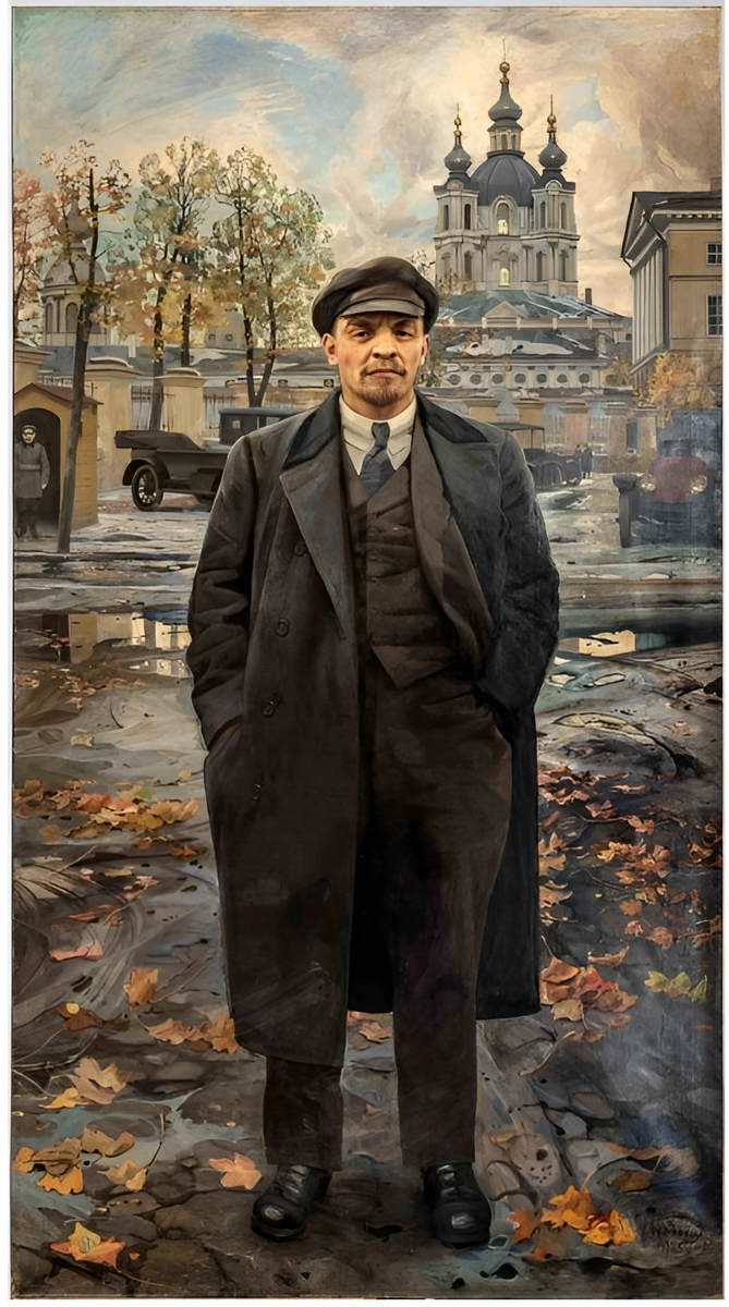 На четыре месяца здание Смольного становится резиденцией Первого советского правительства во главе с В. Лениным. Этот период запечатлен на многих полотнах. Самые известные принадлежат кисти И. И. Бродского. Художник окончил с отличием Санкт- Петербургскую Академию, был учеником И. Е. Репина. Он прославился своими пейзажами и портретами, его работы высоко оценивал художественный критик А. Бенуа. Во время Февральской и Октябрьской революций 1917 года Исаак Бродский находился в Петербурге. Художник воспринял перевороты с энтузиазмом и считал, что позорно «...пройти безучастно мимо тех великих событий». Когда в 1920 г. в Смольном проходил II конгресс Коминтерна, ему даже предоставили мастерскую в Смольном, рядом с Актовым залом. Тогда же художник делал зарисовки с В. Ленина. Портрет В. Ленина выполнен очень искусно - художник отразил даже усталость вождя в тот период.