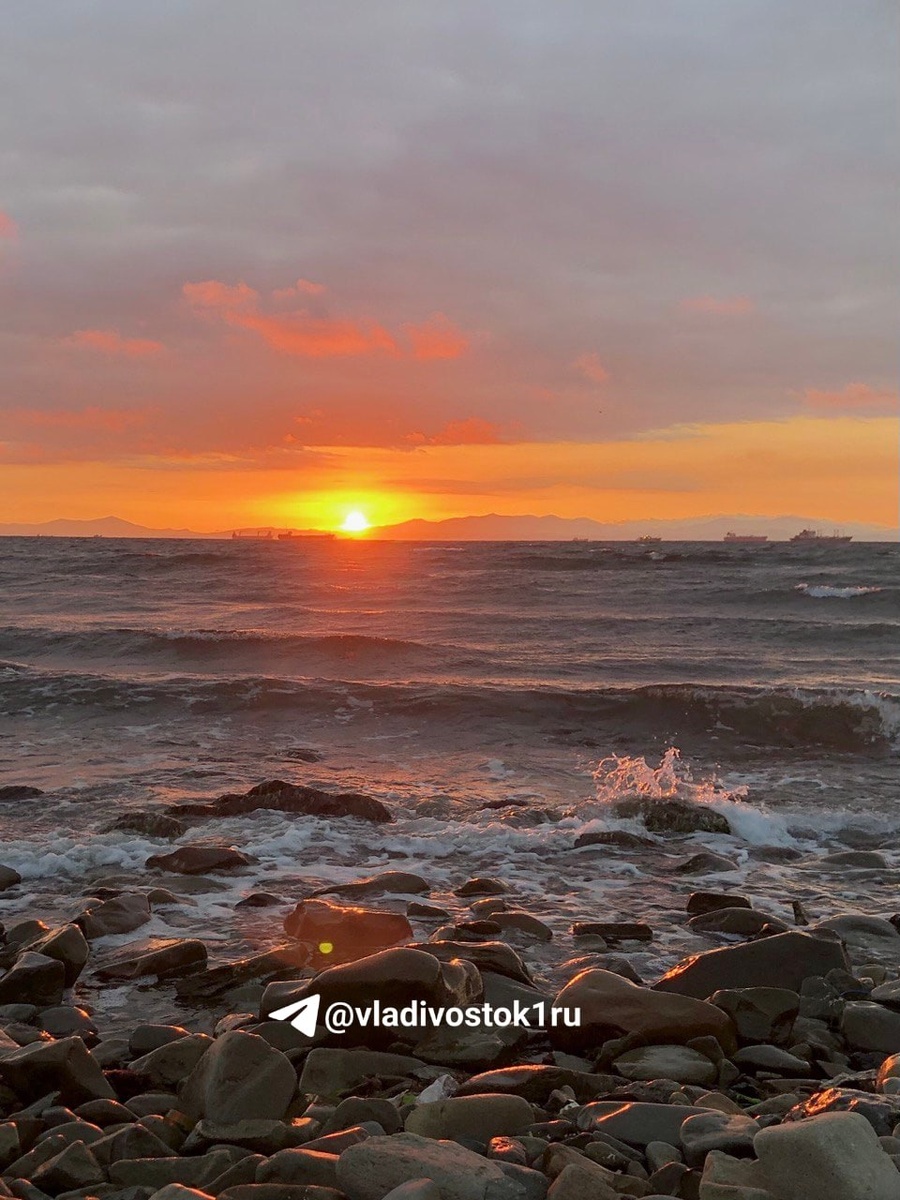 Море сегодня не спокойно, на фоне яркого рассвета выглядит как маленький шторм.