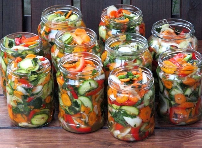 Пикантный, остренький салат-ассорти, звонко хрустящие огурцы, сладкий перец, молодая сочная морковь - и не только. И все это в пикантном маслянистом маринаде - и без “заливки”: маринуется салат исключительно в собственном соку. Да, этот салат готовлю в конце лета, в сентябре. Когда и огурцы уже отходят, и нужно куда-то определять переросшие да неуклюжие. И когда морковь уже хороша, но еще не плотная, зимняя - а нежная, сочная, не тугая - а звонко хрустящая. И когда много сладкого толстокорого перца - красного, мясистого, сахаристого и душистого. А почему ассорти по-грузински? А с таким названием мне его и представили, и угостили - и под таким именем рецепт дали. И - в нем действительно остренькие, прочные, пикантные нотки - те самые, которые мы все любим в яркой, харизматичной грузинской кухне. И да: ассорти очень эффектно смотрится в баночке, и его можно с удовольствием и гордостью поставить и на праздничный стол, и к ужину салат подать. И в пир, и в мир, как говорится. Делюсь простым