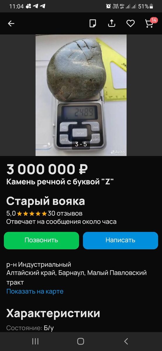 На одном из популярных сайтов, размещено объявление о продаже простого речного камня. Его владелец написал, что это редчайший, единственный в своём роде, речной камень Горного Алтая с буквой