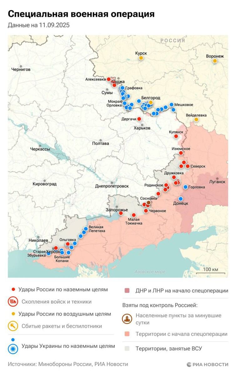 Спецоперация. Обстановка и главные события на 11 сентября. ▪️ Группировка "Восток" освободила Сосновку в Днепропетровской области, говорится в сводке Минобороны. ▪️ ВСУ за сутки потеряли более 1440 человек, два танка, в том числе один Leopard, и РСЗО "Град". ▪️ Силы ПВО в зоне спецоперации сбили 3 управляемые авиабомбы, 4 снаряда HIMARS, ракету "Нептун" и 166 беспилотников. ▪️ New York Times: в Европе думают снизить интенсивность разговоров о возможной отправке войск на Украину и сосредоточиться на поддержке Киева оружием. ▪️ Зеленский признал, что ни у кого в мире нет столько ракет, чтобы сбивать все возможные российские дроны. Источник - РИА Новости