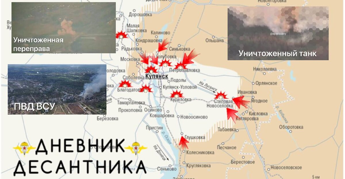 🪂 Купянское направление. На северном охвате города идут ожесточенные бои. Наши войска продвигаются с северной стороны, а также развивают наступление на левом берегу Оскола. ▫️У Голубовки в ходе ожесточенных боев наши войска расширили контроль территории широким фронтом на восток, идёт зачистка кармана у Кучеровки. Здесь ещё большое количество вражеских групп, по которым наносят удары авиация, реактивная артиллерия и дроноводы. ▫️В Северной части Купянска идут бои на обоих берегах Оскола. Нашими операторами БПЛА ведут контроль над прибрежной зоной, для недопущения переброски войск противника с берега на берег, а также наводят реактивную артиллерию и авиацию по инженерным группам ВСУ, которые возводят переправы через Оскол. ▫️На участке Степовой Новоселовки противник ещё прорывается к селу с южной стороны, также частично выявляем группы противника в лесопосадках у населенного пункта. ▫️ Дневник Десантника