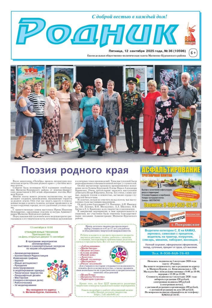 Дина Алборова посетила объект строительства — скважину в селе Новониколаевка. Стр. 2. Депутат Валерий Завгородний выделил деньги на закупку школьной мебели и сплит-систем. Стр.2. Александру Благодареву присвоено звание «Почётный гражданин Матвеево-Курганского района. Стр. 2. В рубрике «Человек труда»: Наталья Борцова: «Не мы выбираем профессию, а она выбирает нас». Стр. 8. О главных событиях уходящей недели на странице Администрации Матвеево-Курганского района. Донские вести, новости культуры и спорта, события недели и информация социальных служб, полезная для каждого. Больше материалов на нашем сайте: https://rodnik-gazeta.ru Материалы газеты доступны в пабликах: https://t.me/rodnikgazeta