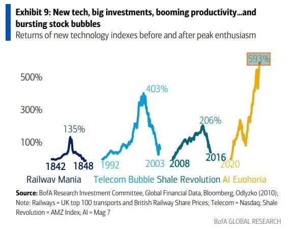 ИИ-пузырь: BofA уже сравнивает с историческими обвалами! 😱 Bank of America проанализировал текущий ажиотаж вокруг искусственного интеллекта и пришел к выводу, что он по масштабу сопоставим с крупнейшими рыночными пузырями прошлого. Это вызывает опасения о перегреве рынка и потенциальной коррекции. 🐨 Комментарий Коалы: Ну что, бро, опять "на этот раз всё по-другому"? BofA не зря бьет тревогу. Когда все бегут покупать одно и то же, пора задуматься о диверсификации и фиксации прибыли. Не дай эйфории ослепить тебя! 🧠 Больше пользы — в канале "Без пафоса | финансы"! Подпишись! #финансы #инвестиции #экономика #безпафосафинансы #ии #пузырь #bofa