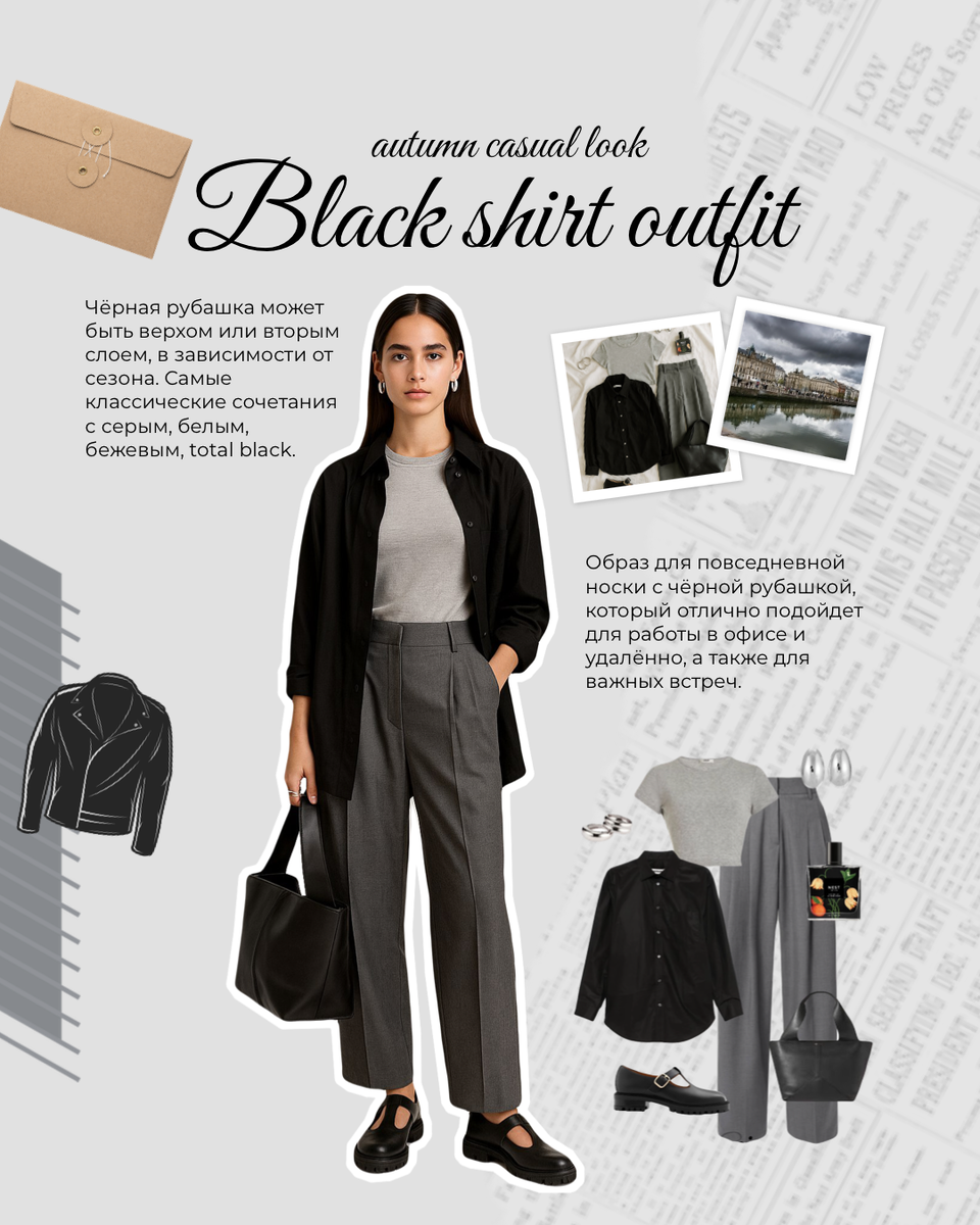 Чёрная рубашка - одна из самых универсальных вещей в гардеробе. Если вы составляете капсульный гардероб, советуем обязательно включить туда одну базовую рубашку чёрного цвета. Давайте посмотрим какие образы у нас получились 👇🏻 Чёрная рубашка может быть верхом или вторым слоем, в зависимости от сезона. Самые классические сочетания с серым, белым, бежевым, total black. Образ для повседневной носки с чёрной рубашкой, который отлично подойдет для работы в офисе и удалённо, а также для важных встреч. Чёрная рубашка может быть верхом или основным элементом с брюками или юбкой, в зависимости от предпочтений в образе. Элегантное сочетание с белым, акцентами красного, сливочным, total black с объемными украшениями под золото. Образ для вечернего выхода с чёрной рубашкой, хорошо подойдет для свидания, встречи с подругами, вечернего выхода на мероприятия. Чёрная рубашка может быть как вторым слоем, так и основанным элементом. Стиль спорт шик отличается своей индивидуальность ю и смешением с