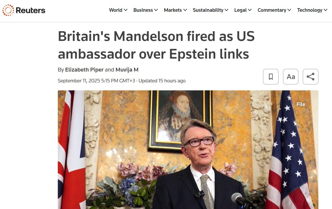 Madelson SACKED as UK ambassador to US over ties with Epstein — Reuters Mandelson forced to leave diplomatic post after exposing his letters to Epstein UK PM Starmer hopes to restore authority with reset