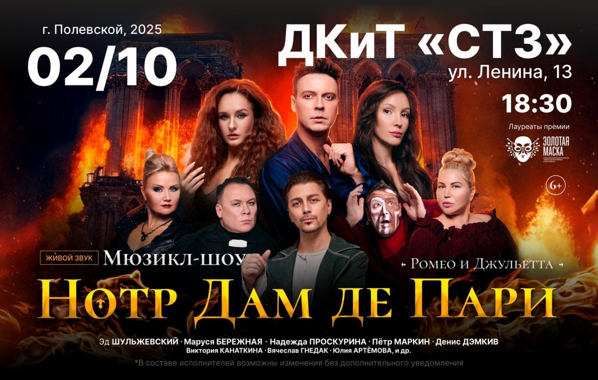 2 ОКТЯБРЯ 18:30 МЮЗИКЛ «НОТР ДАМ де ПАРИ» билеты в кассе Дворца культуры и он-лайн iframeab-pre6470.intickets.ru/event/6561... В нашем мюзикл-шоу не просто звучат арии из знаменитых мюзиклов, а демонстрируются отрывки из спектаклей, которые связаны между собой в единую историю интересным конферансом. Первое отделение — это легендарная история «Нотр Дам де Пари», а второе отделение — история Ромео и Джульетты. Две потрясающие истории в одной программе. Только «живое» исполнение! Состав*: Маруся Бережная/Надежда Проскурина, Эд Шульжевский, Александр Постоленко/Денис Дэмкив, Петр Маркин/Алексей Лосихин, Вячеслав Гнедак, Юлия Артемова, Виктория Канаткина и другие ведущие артисты самых известных, успешных и легендарных мюзиклов. *В составе исполнителей возможны изменения без дополнительного уведомления.
