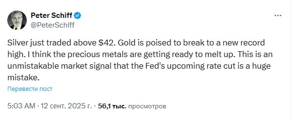 Серебро только что превысило отметку в $42. Золото готово обновить рекордный максимум. Я считаю, что драгоценные металлы готовы к резкому взлёту. Это недвусмысленный рыночный сигнал о том, что предстоящее понижение ставки ФРС — огромная ошибка.