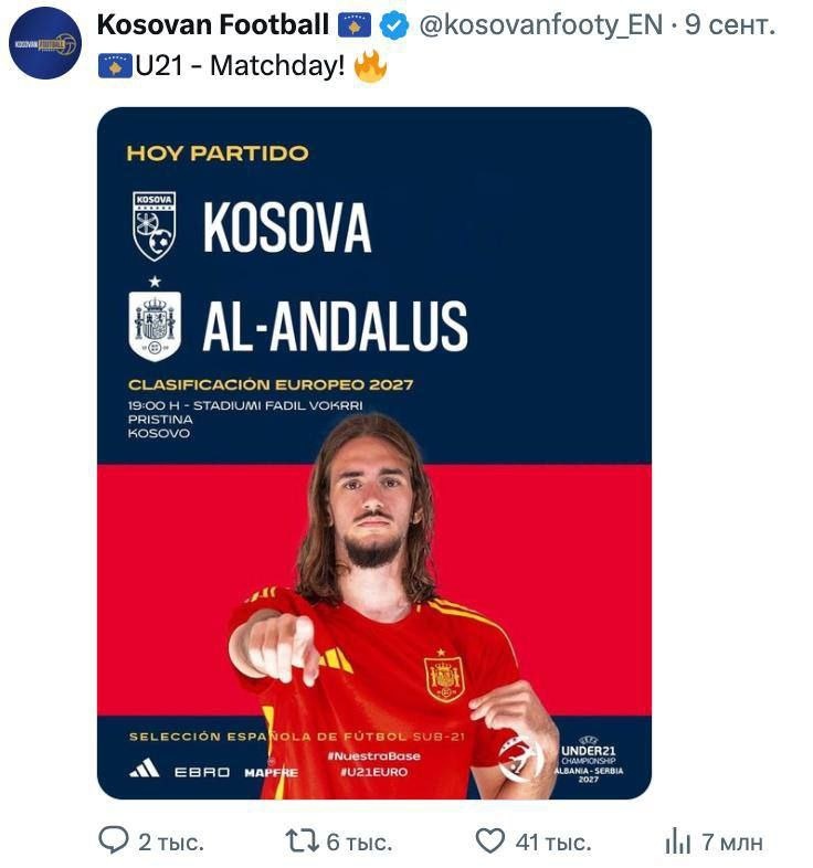 🇽🇰 Косово потроллило сборную Испании в ответ на непризнание независимости. ⚔️ Испанцы оказались с косоварами в одной группе отбора молодёжного Евро-2027. В своих материалах испанская федерация указывает соперника как «Территория Косово» — потому что не признаёт независимость. 😏 В ответ косовары подготовили вот такую официальную афишу на очный матч. В ней Испанию назвали Аль-Андалус — под этим названием была известна так называемая «мусульманская Испания». Это территория Пиренейского полуострова во времена мусульманского владычества в Средние века.
