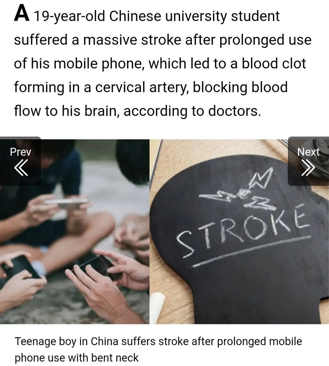 У подростка, который часами сидел с согнутой шеей, случился инсульт из-за длительного «думскроллинга» на телефоне. Из-за неправильной осанки у него образовался тромб в артериях шеи, что привело к нарушению кровотока в мозг. Врачи предупреждают: количество инсультов среди молодых людей будет расти. Чтобы избежать таких случаев, специалисты советуют держать шею ровно, регулярно делать лёгкую разминку и не засиживаться в одной позе слишком долго.