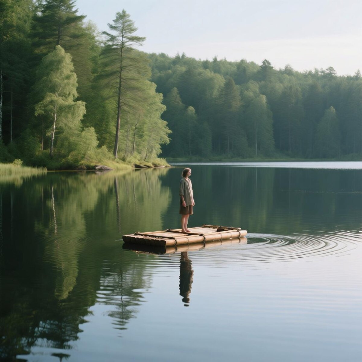 Внезапно человек начинает идти вперёд — к носу плота — и останавливается, дойдя до края.