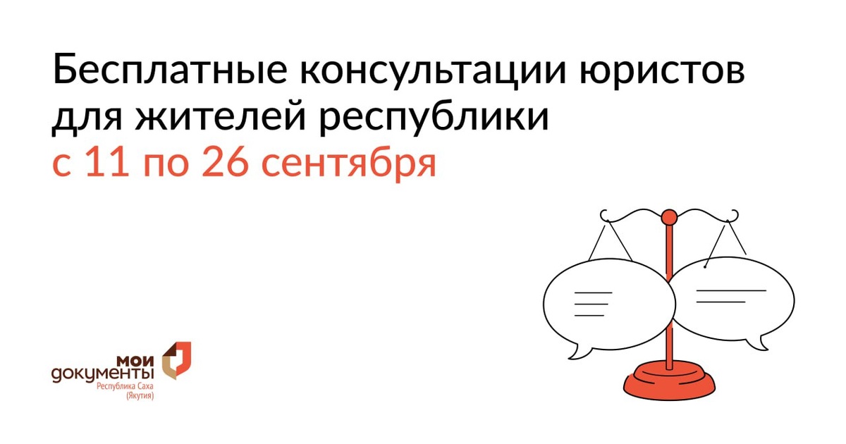 Бесплатная юридическая помощь ко Дню государственности Якутии❤️ 👨👩👦С 11 по 26 сентября 2025 года в офисах центра "Мои Документы" пройдут дни бесплатной правовой помощи, приуроченные ко Дню государственности Республики Саха (Якутия). ❓Куда и когда обращаться: ➡️С 11 по 24 сентября (с 09:00 до 17:00, перерыв с 13:00 до 14:00) – прием звонков в будние дни через сервис «Телефон горячей линии» по номеру: +7 (4112) 50-60-15. ➡️25 сентября (с 09:00 до 17:00, перерыв с 13:00 до 14:00) – дистанционные консультации для граждан, обратившихся в офисах районных отделений МФЦ. Список отделений можно уточнить по номеру горячей линии +7 (4112) 50-60-15 (с 09:00 до 17:00, перерыв с 13:00 до 14:00). ➡️26 сентября (с 09:00 до 17:00, перерыв с 13:00 до 14:00) – прием граждан в офисах МФЦ г. Якутска, расположенных по адресам: ➡️ул. Аммосова, 18 ➡️ул. Лермонтова, 123 ➡️пр. М. Николаева, 44 ➡️ул. Жорницкого, 30/1 ➡️203 мкр-н, корп. 10 Поможем разобраться в вашей ситуации❤️