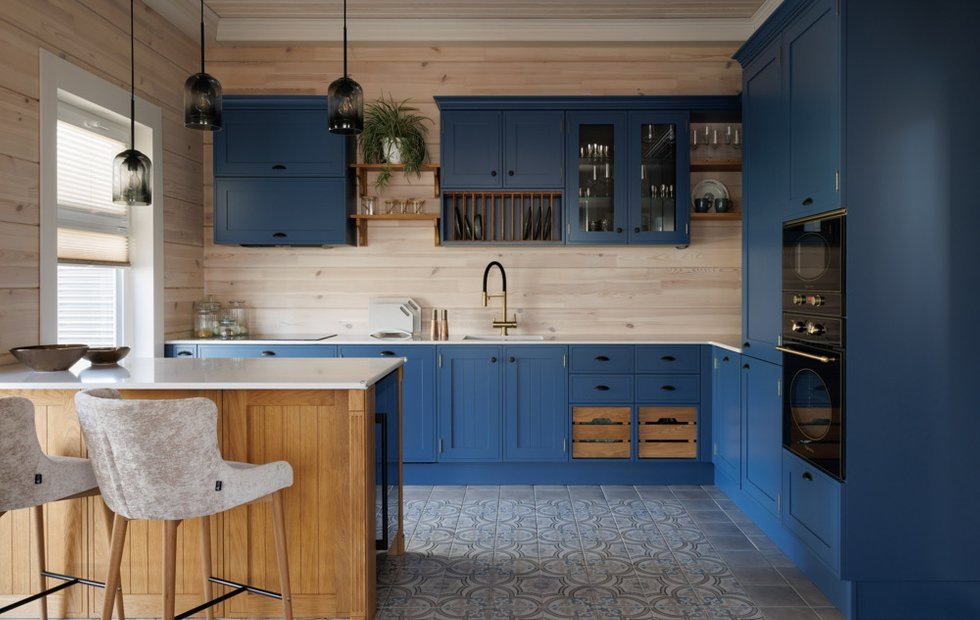 Заказчики не хотели, чтобы дом выглядел слишком «деревянным» с яркими желто-коричневыми оттенками. Поэтому дизайнеры искали светлые тонировки, чтобы придать стенам молочный оттенок и при этом сохранить текстуру дерева. Глубокий голубой цвет кухни был решен изначально и поддержан в столовой через цвет стульев и текстиля.