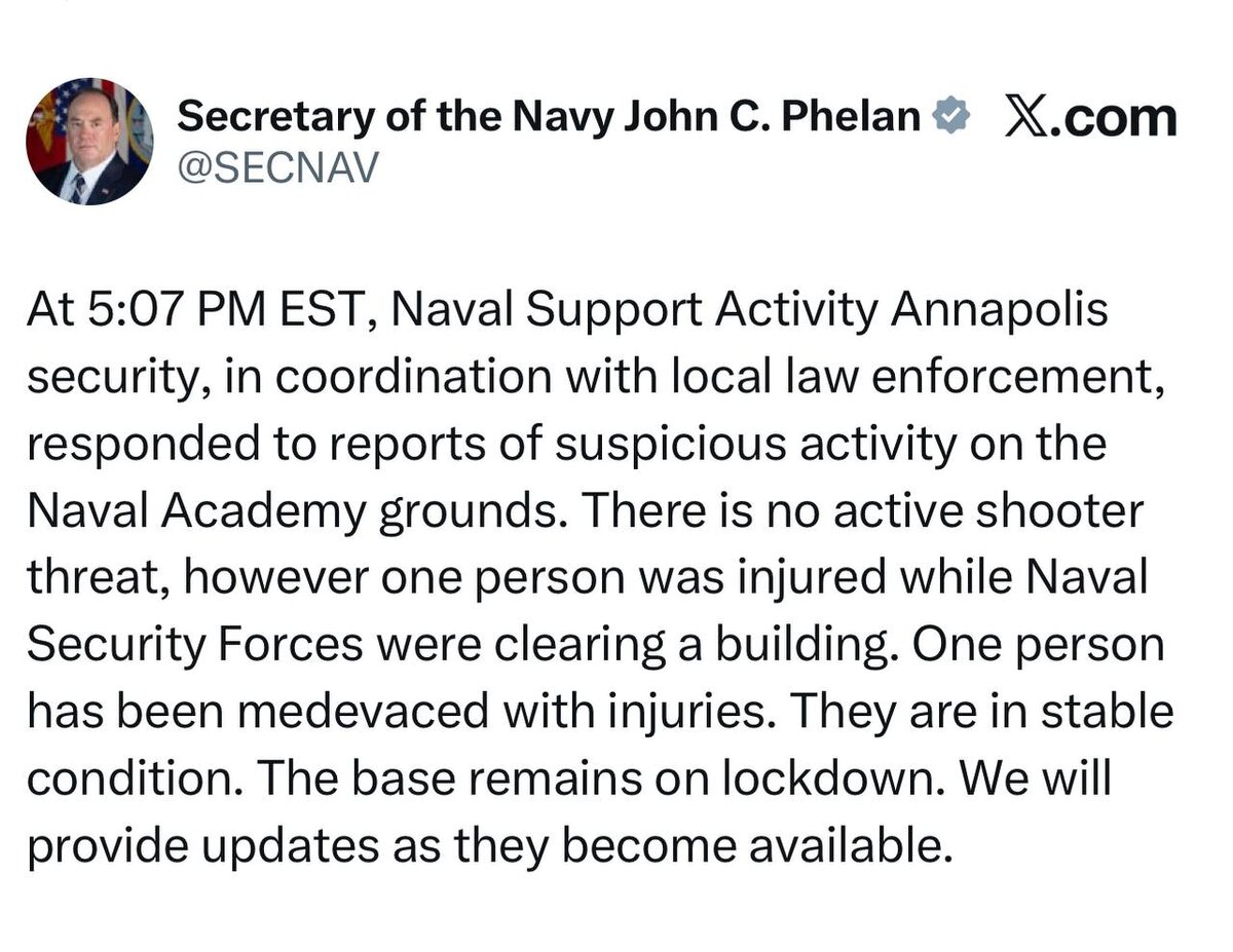 No active shooter threat… one person was injured while Naval Security Forces were clearing a building — Sec. of the Navy John Phelan on Naval Academy lockdown