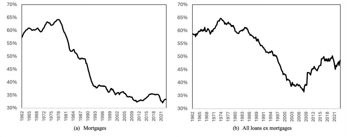 Большинство инвесторов знает, что после финансового кризиса банки столкнулись с ужесточением требований к капиталу, и многие считают это причиной спада банковского кредитования. Однако данное исследование показывает, что спад банковского кредитования начался гораздо раньше, и основной движущей силой этого спада стал рост теневого банкинга. В период с 1970 по 2023 г. доля кредитов, выданных банками США и отражённых в их балансах, снизилась с 60% до 35%. Это падение было особенно значительным в секторе ипотечного кредитования, где стали доступны ипотечные кредиты, обеспеченные правительством США. Это означает, что большинство ипотечных кредитов в США сегодня выдаются с той или иной формой поддержки государственных агентств, и у банков мало стимулов выдавать ипотечные кредиты, которые невозможно списать с их баланса. Но даже если мы посмотрим на банковское кредитование без учёта ипотечных кредитов, мы увидим, что доля кредитов, удерживаемых на балансах банков, значительно сократилась. До