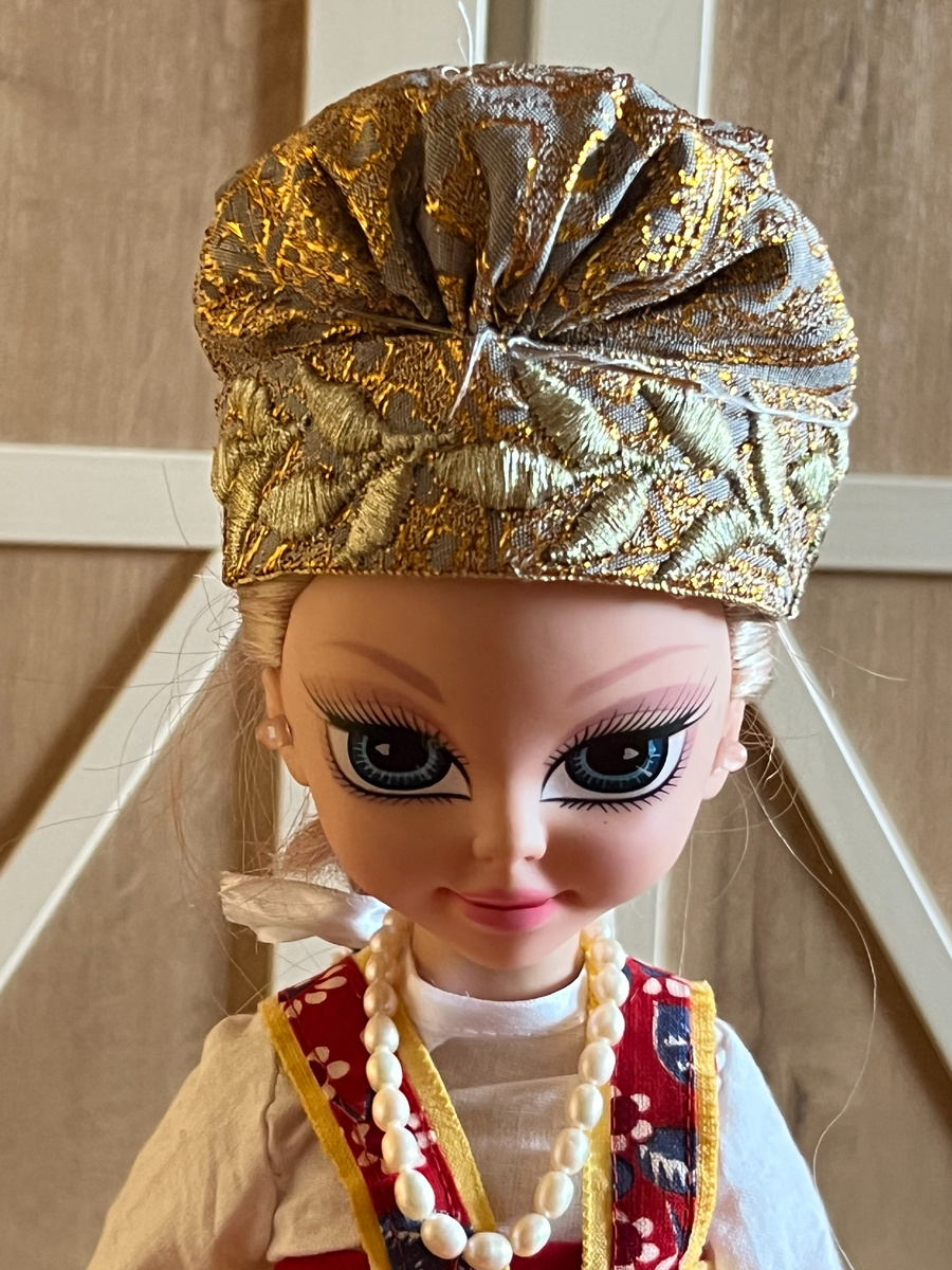 Борушка - русский головной убор. Миниатюра. Борушка (XIX в. Вологодская губерния) — закрытый женский праздничный головной убор, состоящий из очелья на твердой основе и донца. Донце собрано в сборки и пришито к очелью, слегка выступая над его передней частью. Борушка украшена золотной вышивкой, перламутром, стеклами. https://narjad.narod.ru/izgoto/golovuborisever.htm Борушка очень интересно шьется, в районе очелья подкладывается валик, что бы создать выступ, сборочки... Я к донцу пришила валики, сколько их должно быть я не знаю. В музеи Тальцы, я рассматривала повойник с сборочками, который шьют в Иркутской творческой мастерской "Оникс", валик там один, большой из хлопка. Я действовала методом подбора, тем более шью на куклу. Когда мне объем понравился тогда и остановилась. На фото Донце: основа воротничковая клеевая, для жесткости. Обтянула бархатом. Валики тоже из бархата. После я взяла кусочек парчи, примерно 40-30 и начала выкладывать складочки(Очелье). Пришила подклад из бархата