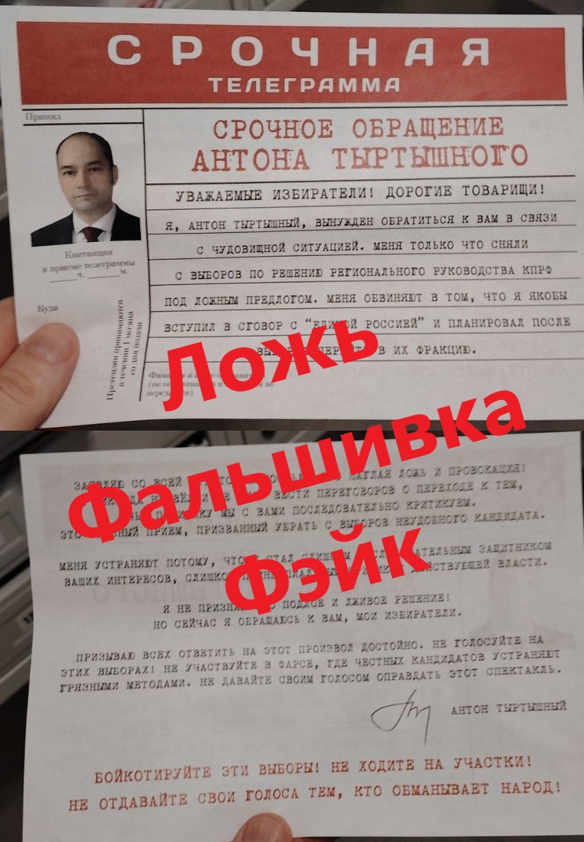 Депутат-коммунист заявил о разбрасывании фейковых листовок от его имени о снятии с выборов Вице-спикер новосибирского горсовета Антон Тыртышный (КПРФ), баллотирующийся в заксобрание, заявил о провокации. От его имени в ночь на первый день выборов по почтовым ящикам избирателей раскидали фейковые листовки. «Опять провокация моих конкурентов. Сегодня ночью по почтовым ящикам раскидали фальшивую листовку от моего имени, что меня якобы сняли с выборов, — написал он в телеграме. — Это вранье, я участвую в выборах и планирую победить!» Среди прочего неизвестные от имени кандидата предлагают бойкотировать выборы. 📌 12-14 сентября проходят выборы в горсовет Новосибирска и заксобрание региона, а также ряд местных выборов в районах области. Антон Тыртышный баллотируется в заксобрание по округу №21 (Железнодорожный и часть Заельцовского района Новосибирска). По тому же округу идут экс-глава департамента соцполитики мэрии Ольга Незамаева («СРЗП»), действующий депутат Константин Антонов («Род